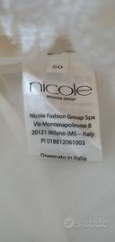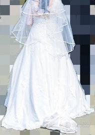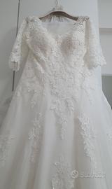 Vendo abito da sposa, della linea Nicole Jolie, taglia 50, con inserti e maniche in pizzo. Velo con pettinino, gonna da mettere sotto il vestito. Usato ad agosto 2021, ben conservato.