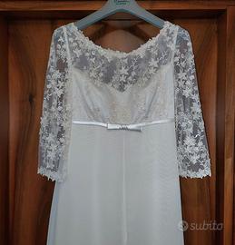 Abito da sposa da Atelier, color avana con piccolo strascico, di pizzo e chiffon con bottoni sulla schiena, si presenta in ottimo stato e molto ben conservato. Usato una sola volta di tg.44 altezza persona 167/170, un vero affare.