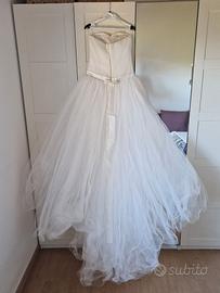 Vendo bellissimo abito da sposa con ampia gonna in tulle con strascico. L'abito è di pregiata manifattura: il corpetto è in raso, coperto da tulle in pieghe e chiuso sul retro da bottoncini in perla. La gonna è in raso con stracico, con 6 strati di gonne in tulle che conferiscono un volume ampio e romantico. In vita un cinturino in raso che si chiude sul retro con fiocco e lunghe ciocche che ricandono sullo strascico. L'abito è in ottime condizioni, è stato conservato con attenzione e non presenta difetti di usura. È stato lavato in pulisecco, non stiraro. Taglia 42-44.