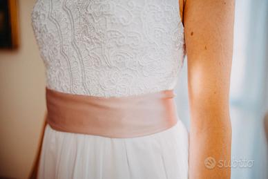 Abito da sposa bellissimo e comodo in pizzo e chiffon, colore bianco ottico con cintura in seta colore rosa antico. Taglia 40. Io sono alta 1.63 m. Per le misure mandatemi un messaggio che qui non ci stanno tutte le foto. Regalo stoffa in avanzo della cintura (usata come decorazione sul tavolo della torta) e nastro per bouquet (vedi foto). Se interessata vendo anche una stola in chiffon dello stesso colore dell'abito a 12 euro.