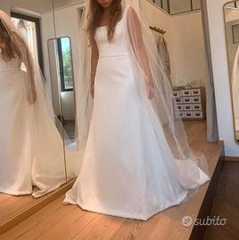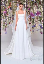 Abito modello Tammy di Atelier Emè. Bianco ottimo con un micro piquet che lo rende unico. Fiocco sulla schiena e scollo quadrato sul decoltè. Con abito dono anche velo di 3 metri a copertura della coda dell'abito e coprispalle romantico fatto a mano.