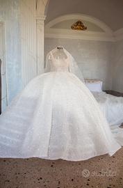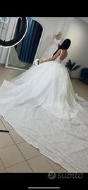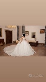 Vendo splendido abito da sposa stile principessa, realizzato su misura da atelier specializzato. La taglia corrisponde a una M (indicativamente 40-42 italiana), con possibilità di ulteriori piccole modifiche grazie alla struttura dell’abito.