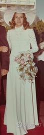 abito da sposa classico con caratteristiche tipiche della moda matrimoniale degli anni '70, collo alto e maniche lunghe decorate con inserti in pizzo, con un ampio cappello coordinato. TAGLIA S