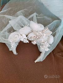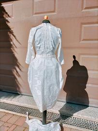 Composto da abito corto, sopragonna a sbuffo con chiusura a fiore in tessuto, corsetto a vita, coroncina di fiori in tessuto con velo corto, bouquet di fiori in tessuto coordinati, guanti corti in raso e guanti lunghi in pizzo.