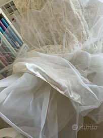 Abito da sposa fine anni 80 interamente in pizzo ,cucito a mano da una sarta ,dietro allacciato con 25 bottoncini in raso,taglia 42/44.Ha 3 sottogonne :una in organza rigida (che si può togliere),una in raso bianco ,una in tulle,ha le spalline e na arricciatura in organza sulle spalle .Qualche piccola macchia di ingiallimento sotto le ascelle e in altri punti,da rinfrescare in lavanderia.Misure:da ascella ad ascella cm.41,resto a disposizione per ulteriori domande o chiarimenti,a richiesta posso farlo misurare al mio domicilio