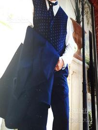 Abito alta moda sposo blu elegante con gilet in seta blu , ascott e anche camicia bianca con piccolo colletto alla monacale. Acquistato da creazioni Elena a Lecce vendo a ? (Tg 54 ).