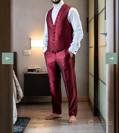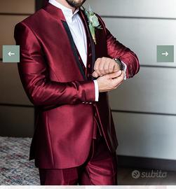 Vendo abito da sposo Carlo Pignatelli, rosso borgogna, cangiante e luminoso, le foto parlano da sè. Prezzo di acquisto 1100 euro. Compreso di camicia bianca con punto luce (brillante) sul colletto alla coreana, sacca porta abito e volendo anche le scarpe, numero 43. Abito acquistato a luglio 2025, appena ritirato dalla lavanderia, perfetto nessun segno di usura, no torte addosso, no champagne, no scherzi, l’abito è praticamente nuovo apparte le poche modifiche fatte sulla lunghezza maniche e pantalone. Sono alto 1.74 e peso 75kg, quindi corporatura a tendenza magra. Per qualsiasi info scrivete pure