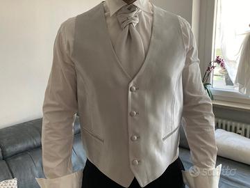 Smoking da sposo fatto a mano Made in Italy di Sartoria Rossi Milano, taglia 50 (uomo altezza media 175-185 e tra gli 80-90 chili) in perfette condizioni, utilizzato una sola volta, completo di pantaloni, giacca, camicia, gilet e cravatta.