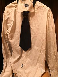 Abito da sposo blu scuro, taglia 52, composto da giacca lunga, pantalone, hilet, camicia e cravatta.