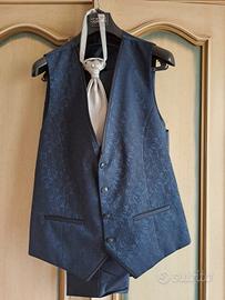 Abito da sposo elegante blu, cangiante al grigio. Tenuto nel sacco di acquisto. Taglia 52 ma veste poco. Il vestito così completo è dello Stilista Emanuele Valenti. Chiamare al cell o scrivere su whatapp