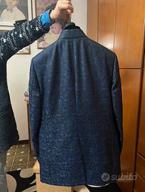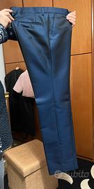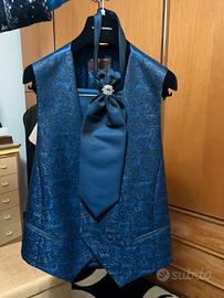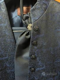 Colore blu notte, damascato, veramente molto bello, comprensivo di giacca e pantalone, gilet, cravatta, come da foto.
