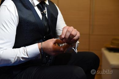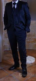 Vendo elegantissimo abito da sposo di sartoria, firmato Lorenz, damascato blu, taglia 58. Indossato una sola volta, quindi praticamente nuovo. Vendesi completo di camicia, cravatta, cintura e gemelli. Prezzo trattabile.