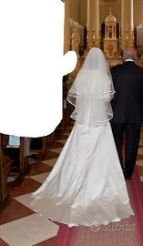 Abito da sposa, taglia 42/44, corpetto con rouches, decorato con perline, compreso di velo, guanti al gomito, spallina all'americana