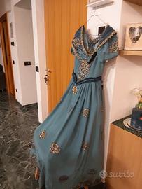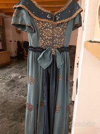 Abito da dama dell'800 da usare per carnevale. Fatto a mano in shantung sintetico (tipo particolare di seta) color verde petrolio con applicazioni fiori oro. Ha strass su fascia scollo e sul corpino. In aggiunta relativa sottogonna in tessuto. Veste una taglia 42-44