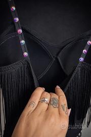 Splendido abito da competizione per balli latino-americani, colore nero, elasticizzato e molto luminoso. Decorato con strass iridescenti, frange sul corpetto e gonna con inserto glitter. Inclusi collarino e bracciali coordinati. Taglia S con Ottima vestibilità e grande effetto in pista. Usato solo per foto. Mai apparso in gara.