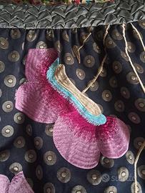 La gonna, leggermente ampia, ha una base grigio scuro decorata da motivi color bronzo ed è arricchita da due grandi fiori ricamati, dalle splendide tonalità del rosa, fucsia e azzurro, veri protagonisti del design.