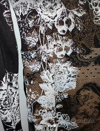 Abito marrone con fiori bianchi e neri, pizzo sul fondo e cinturino in raso marrone
