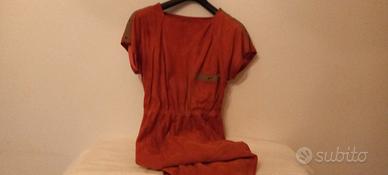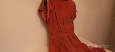 abito di camoscio color mattone/aragosta,spalle sbottonabili, due tasche laterali, girovita elasticizzato,interamente foderato. misura ascella/ fondo cm.75 Girovita elasticizzato cm.70/90