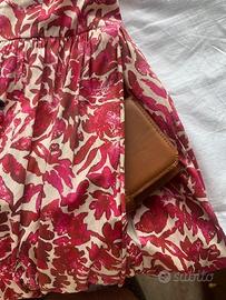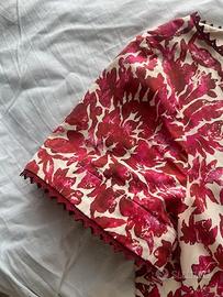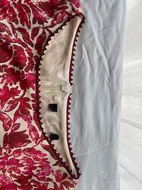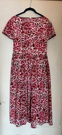 Delizioso modello di abito in freschissimo popeline di cotone 100% in fantasia floreale nei toni dal rosso al fucsia su fondo bianco. Manichine e scollo bordati in mini pizzo crochet bordeaux.
