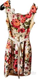 Splendida fantasia floreale, con cintura in stoffa sulla vita. Abito semplice ed elegante, adatto ad essere indossato sia con sneakers e giubbino jeans, sia nelle occasioni più importanti. Anche abito da cocktail. Realizzato in ottimo cotone e leggermente elasticizzato per il massimo confort.
