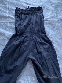 Tuta 3/4 donna colore blu. La Fascia in vita e le fascette sul fondo permettono di scegliere quanto la si vuole rimborsare. In alto ha sulla schiena una fascia semi elastica e sul davanti un bel motivo ricamato.