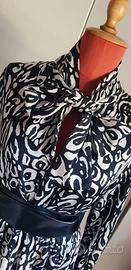 Abito donna bianco e nero con elastico in vita, balza finale. Manica lunga con polso arricciato. Scollo a V con sciarpina modulabile. Tessuto 100% poliestere. Taglia XL. Misure: lunghezza 89 cm.; seno 41 cm.; spalle 50 cm. Veste una 48/50. Capo indossato poche volte. La cintura nera presente nella foto non è inclusa, è puro scopo illustrativo. L'abito può essere indossato anche in inverno con sopra un cardigan e stivali per uno stile casual, con cardigan e décolleté per uno stile chic/elegante.
