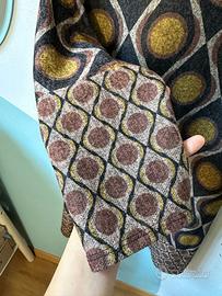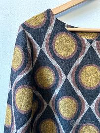 Vestito donna lunghezza midi con fantasia geometrica che presenta un motivo a rombi e cerchi sui toni del grigio antracite, senape e marrone. Il capo ha un distinto stile che ricorda la moda vintage degli anni '70. Taglio dritto, maniche a tre quarti, scollo tondo.