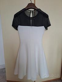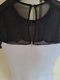 Abito donna elegante da cerimonia con gonna svasata + coprispalle, con zip e bottone posteriore, collana decorativa color oro e parte nera trasparente.