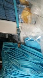 Colore turchese, taglia S, modello fasciante con spalline ricoperte di pietre. Completo di coprispalle di tulle. Usato una sola volta, già lavato in lavanderia, pronto da indossare.