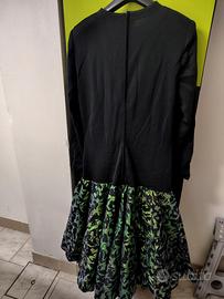 vendo abito di sartoria, in tessuto di lana nero, vita bassa, gonna molto ampia colore verde e nero lucente, sottogonna in raso nero e tulle.