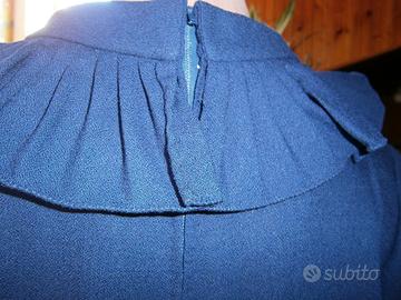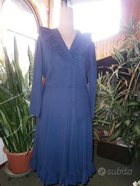 Abito da donna elegante, Lucy style, di crepe di lana blu -anni '80 -TAGLIA 46 con rouches plissè