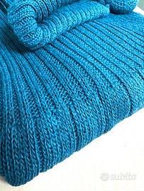 Vestito donna in maglia smanicato a collo alto di colore blu petrolio - turchese scuro, caratterizzato da una lavorazione a coste verticali e da un dettaglio decorativo a forma di fiore in tessuto applicato sul petto. Vestibilità comoda, per taglie M ed L. Petto 44 cm. Fianchi 58 cm. Lunghezza 75 cm.