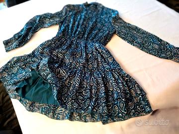 Poliestere 100%, mezza lunghezza, fantasia paisley predominanza blu/verde, maniche lunghe, colletto con chiusura a bottoncini sul retro, vita elasticizzata. fodera interna. Per tutte le stagioni ed ogni occasione.