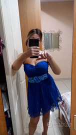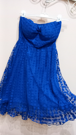 Abito donna décolleté in tulle fantasia pois, splendido color blu cobalto. Vita elasticata. Ottima vestibilità. Taglia 42. Cintura in regalo