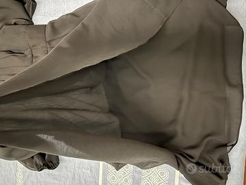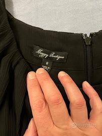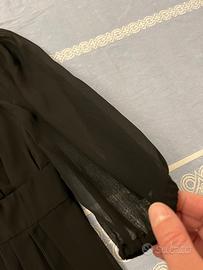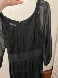 Abito nero in poliestere, con fodera nel corpo e nella gonna, manica 3/4 trasparente. Gonna a balze. Acquistato negli USA, usato pochissimo , praticamente nuovo. Taglia 8 US, che corrisponde ad una 44, veste comodo.
