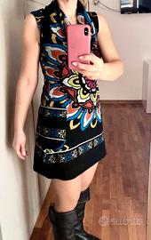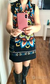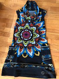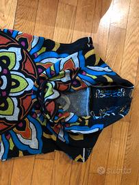 Abito invernale smanicato in viscosa, elastico, con collo sciallato, comodo e caldo. Fondo nero con motivi colorati tg 42