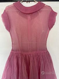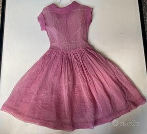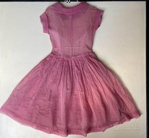 Abito vintage autentico anni '50 in tessuto trasparente colore rosa a piccoli pois bianchi, collo e maniche corte con bordo plissettato, vaporosa sottogonna in tulle, cerniera posteriore, in buone condizioni.
