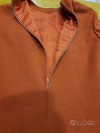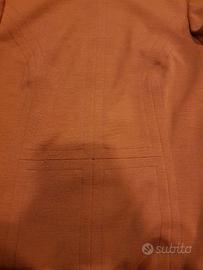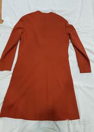 Abito donna vintage sartoriale, color ruggine, con scollo tondo e zip sul retro, dettagli squadrati sulla parte di fronte, tessuto tipo maglina.