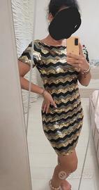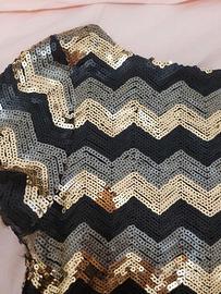 Bellissimo abito Dry Lake, taglia S, con fantastico motivo a zig zag in paillettes oro e nere. L'abito è corto e aderente, perfetto per una serata speciale.