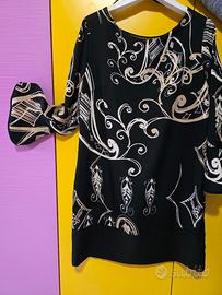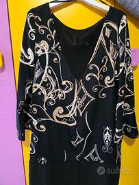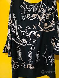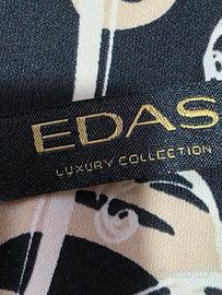 Splendido abito corto (mini o sopra il ginocchio a seconda dell'altezza) della linea EDAS Luxury Collection. Un capo raffinato dal design moderno, caratterizzato da una stampa astratta a contrasto e un taglio molto femminile. Dettagli del Capo: Marca: EDAS (Luxury Collection) Taglia: 46 (IT) - Corrisponde a una L. Colore: Nero con stampa grafica color crema/champagne. Scollo: Girocollo sul davanti e una bellissima scollatura a V profonda sulla schiena, che aggiunge un tocco sensuale ed elegante. Maniche: Lunghezza a 3/4 con polsini a campana (bellissimi indossati!). Taglio: Linea leggermente ad A, scivola bene sulle forme senza stringere. Produzione: 100% Made in Italy.