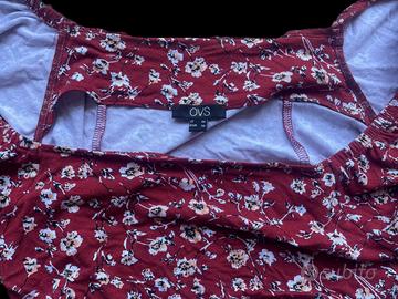 Abito corto floreale bordeaux con stampa a piccoli fiori bianchi e maniche a 3/4. Scollo morbido e tessuto elasticizzato che si adatta alla figura. Perfetto per un look casual o romantico. Taglia M(42-44), vestibilità comoda e femminile. Usato pochissimo, in ottime condizioni.
