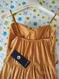 Bellissimo vestito in maglina tessuto brillantinato leggero e fresco color oro con coppe preformate e spalline regolabili cinturone trasparente mai indossato