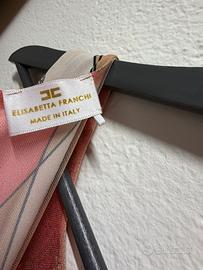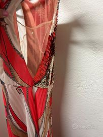 Abito Elisabetta Franchi indossato solo una volta, color corallo con inserti di paillette e catene sul petto, gonna plissettata