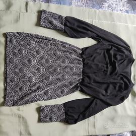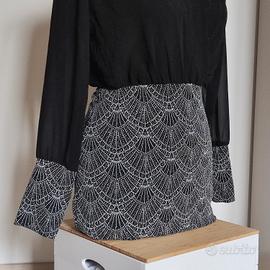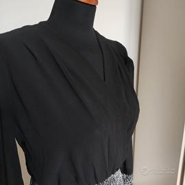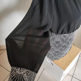Meraviglioso abito da cocktail, parte superiore colore nero in tessuto morbido, semi traspa (no è esagerata come trasparenza, un elegante vedo non vedo). Mano e gonna in tessuto più strutturato con meraviglioso decoro geometrico arricchito da luminosi strass. Davvero d'effetto una volta indossato. Gomma a lunghezza media coscia circa. Sensuale ma con eleganza. Elasticizzato, taglia unica. Veste bene da S a L. Misure: Da un'ascella all'altra 45 cm (ha lo scollo incrociato quindi di adatta in base alla taglia del seno. Vita (con elastico) da 27 cm a 44 cm Lunghezza 81 cm. Usato due volte, in ottime condizioni. Non presenta né macchie, né rotture. Ritiro a Romano di Lombardia in base ai miei orari