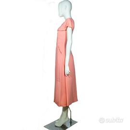 Abito longuette elegante tg.40 di Mila Schön. Color rosa pesca, longuette, la lunghezza può arrivare al polpaccio, poi dipende dall'altezza della persona. ll taglio è diritto, la gonna è leggermente svasata che si apre con tre grandi pieghe. La scollatura è a V, le maniche sono corte che scendono leggere e ondulate sulle spalle. Sui fianchi vi sono due tasche laterali oblique. Nuovo mai indossato. Adatto per un Matrimonio, Cresima o Battesimo.