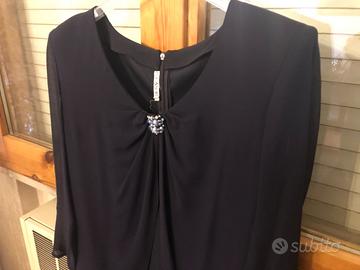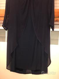 Vendesi abito elegante di Casor in seta e voile, colore blu notte, decorata alla scollatura con perle, taglia 46.