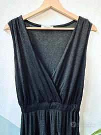 Vestito da sera, lungo, senza maniche, incrociato sul seno e con fascia elastica e cintura in vita. Tessuto lurex colore nero scintillante. Ideale per occasioni speciali. Taglia unica, vestibilità S/M, elastico regolabile in vita. Larghezza vita 31 cm, da spalle a vita 39 cm, lunghezza abito 140 cm.