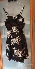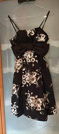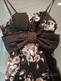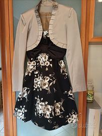 Vestito estivo per cerimonie, corto (lunghezza: sopra il ginocchio), nero con fantasia fiori. Abbinata una giacca colore champagne.