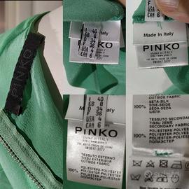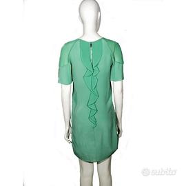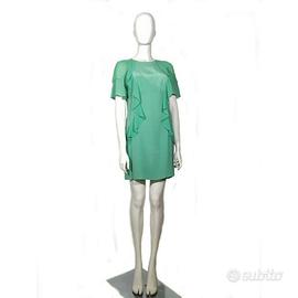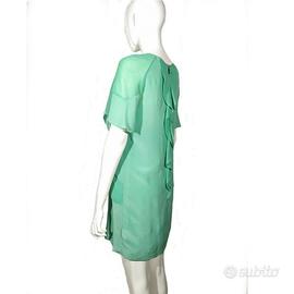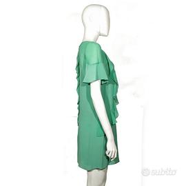 Abito verde elegante di Pinko tg. 40. Linea diritta, scollatura rotonda, si chiude dietro con una cerniera. Maniche corte, arriva sopra il ginocchio. Leggero, presenta due decorazioni come volant dello stesso tessuto che partono dalle spalle e arrivano ai fianchi. Elegante e raffinato. C'è una piccola macchia sulla fodera-sottoveste dell'abito. materiale: seta e poliestere come riportato sull'etichetta merceologica in foto.