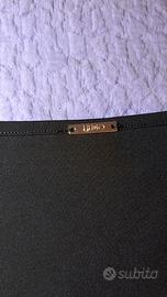 Abito nero firmato Liu-Jo lunghezza sotto il ginocchio aderente in figura in elastan. Scollo a "V" con drappeggio centrale circolare fissato da anello aperto in metallo dorato. Taglia "L" (44/46).